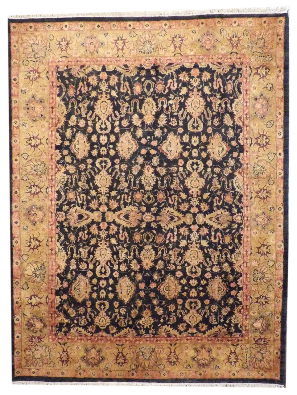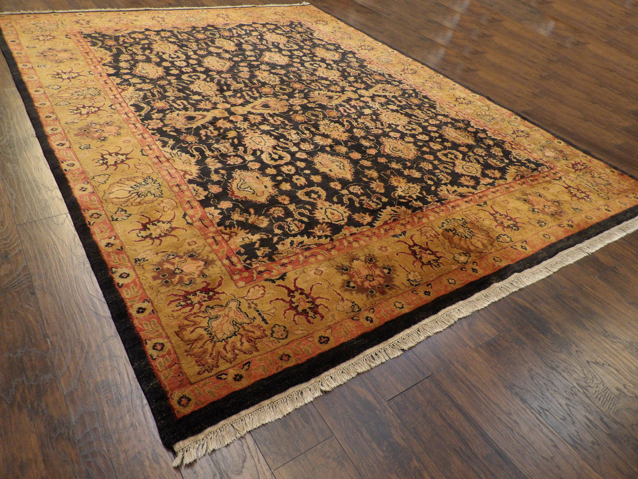 Exact Size:9'0"x12'0"Construction:Hand KnottedShape:RectangleMaterial:WoolColor Combination:Black/GoldOrigin:India